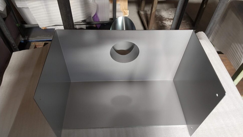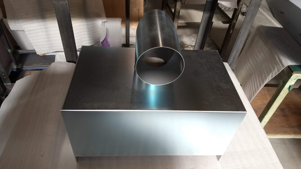 本事例は、半導体装置用排気ダクトカバーです。 気密性を確保する必要があり、漏れがないように筐体部とパイプ部の溶接を行っていることがポイントです。 |