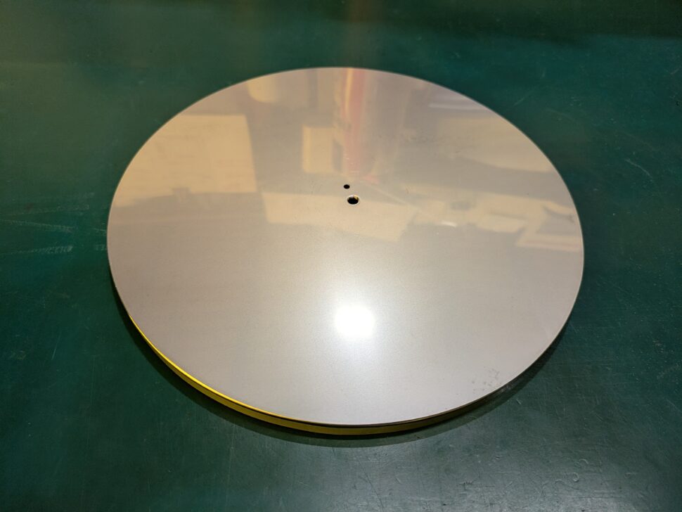 本事例は、半導体製造装置用の受け皿です。ヘラ絞りで加工をしており、真円がでているかが重要で、溶接と比較して歪みがない仕上りとなっています。その他加工については、治具を製作してレーザー加工をしています。