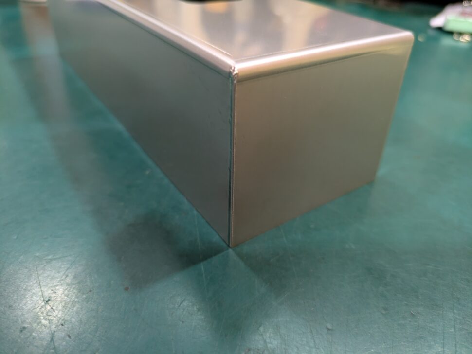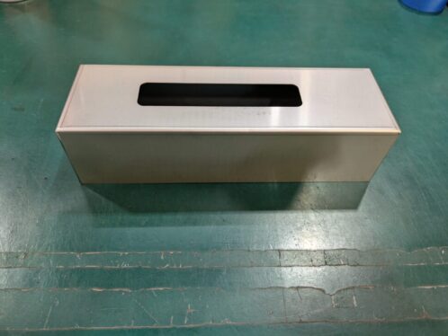 こちらは医療機器用のセンサーカバーです。カバーで手を触れる可能性があるため、安全性を担保するために角部の仕上げを行っています。また外観品質も求められていたため、溶接部の仕上がりがきれいになるように加工を行っています。