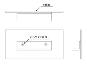 例えば、下記図3のケースは、平板にL字部品を取り付ける加工図面で、2か所のスポット溶接の取付指示および図面に外観面の記載があります。この場合、外観品質を確保するために電流値を弱くして溶接を行いますが、2か所では溶接強度が不十分です。このように加工時のことを理解して溶接指示をしなければ、指示が少なすぎたり、逆に過剰になってしまうなど不具合が生じてしまいます。